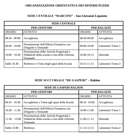 I due plessi, Sede Centrale e De Gasperi, avranno una diversa organizzazione oraria per consentire la possibilità di muoversi da un plesso all’altro, qualora si fosse interessati alla visita di entrambe le sedi.